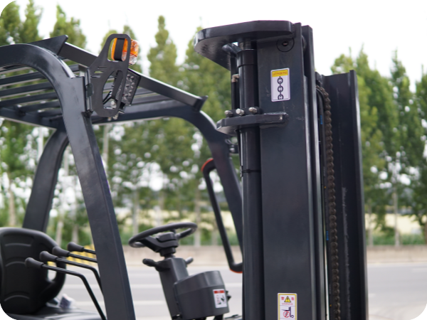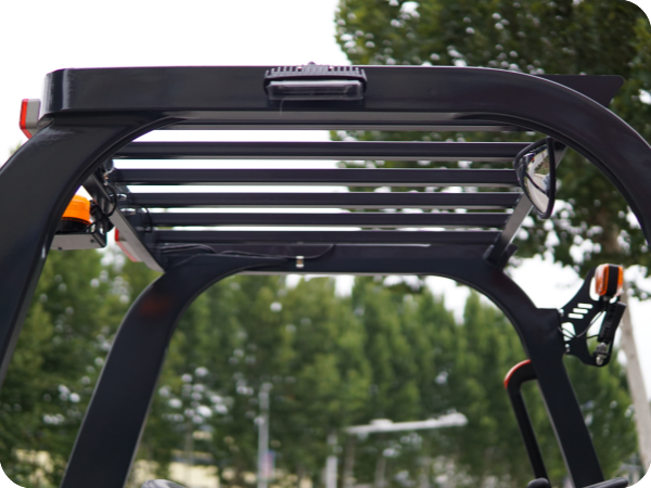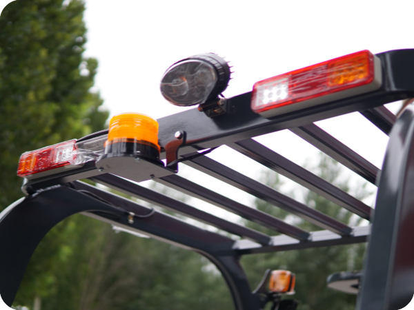 4. A heavy-duty steel overhead guard shields operators from falling objects, while 360° visibility warning beacons and all-weather work lights keep both the driver and surrounding personnel aware in busy, low-light environments.